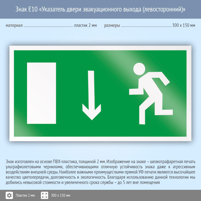 Знак E10 «Указатель двери эвакуационного выхода (левосторонний)» (пластик, 300х150 мм) в Твери купить