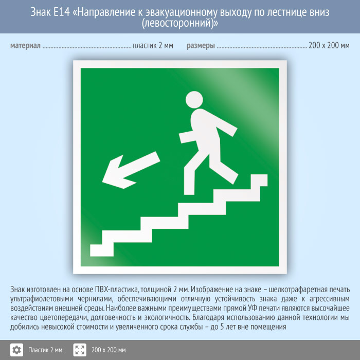 Знак E14 «Направление к эвакуационному выходу по лестнице вниз (левосторонний)» (пластик, 200х200 мм) в Твери купить