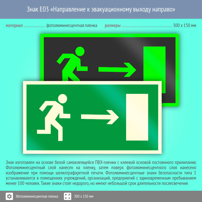 Знак E03 «Направление к эвакуационному выходу направо» (фотолюминесцентная пленка, 300х150 мм) в Твери купить