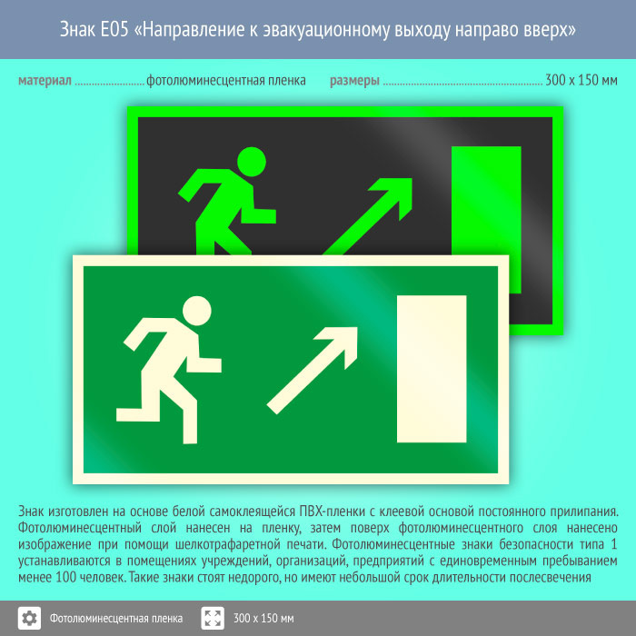 Знак E05 «Направление к эвакуационному выходу направо вверх» (фотолюминесцентная пленка, 300х150 мм) в Твери купить