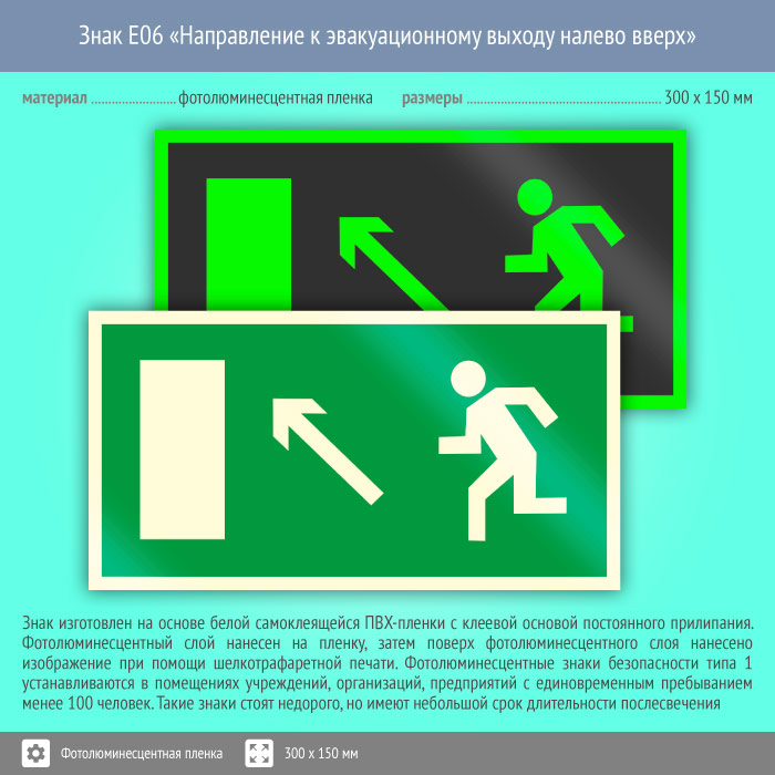 Знак E06 «Направление к эвакуационному выходу налево вверх» (фотолюминесцентная пленка, 300х150 мм) в Твери купить