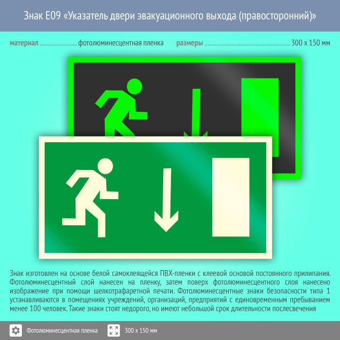 Знак E09 «Указатель двери эвакуационного выхода (правосторонний)» (фотолюминесцентная пленка, 300х150 мм) в Твери купить