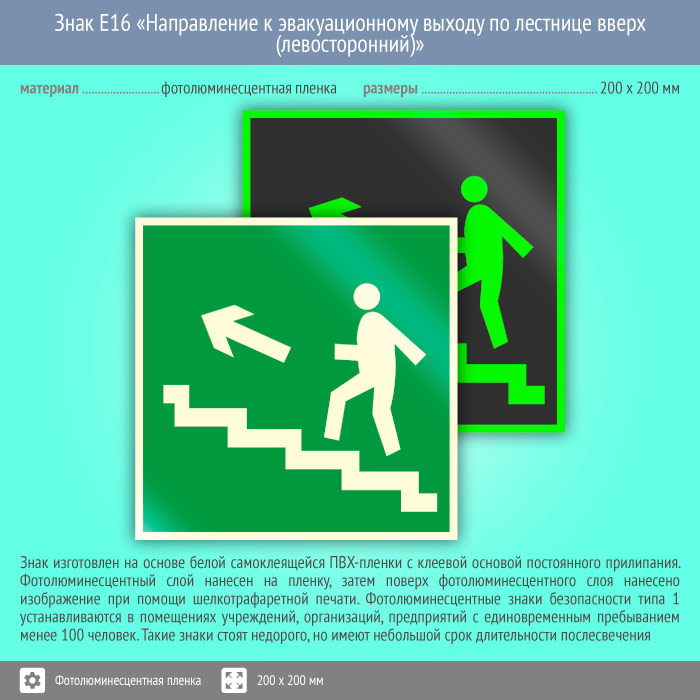 Знак E16 «Направление к эвакуационному выходу по лестнице вверх (левосторонний)» (фотолюминесцентная пленка, 200х200 мм) в Твери купить