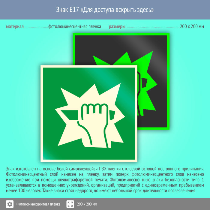 Знак E17 «Для доступа вскрыть здесь» (фотолюминесцентная пленка, 200х200 мм) в Твери купить