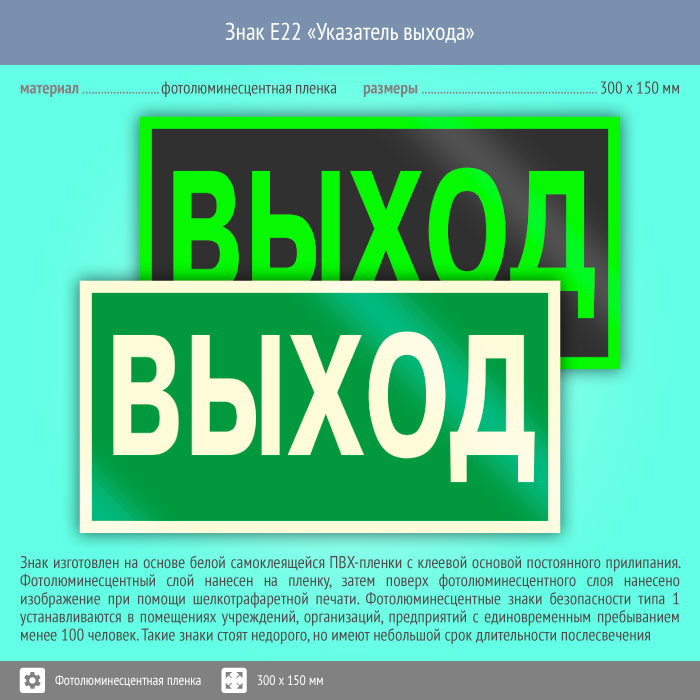 Знак E22 «Указатель выхода» (фотолюминесцентная пленка, 300х150 мм) в Твери купить