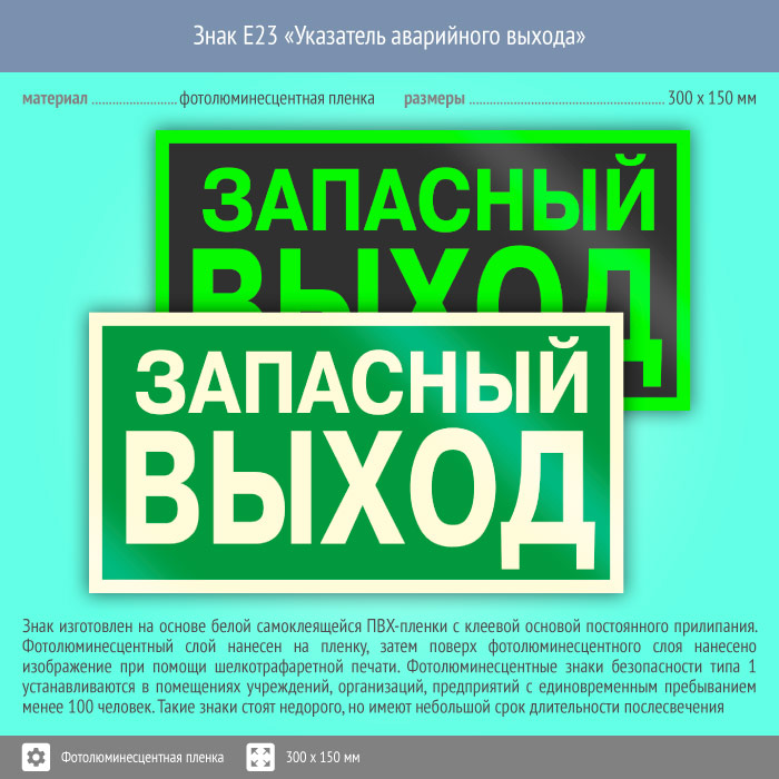 Знак E23 «Указатель запасного выхода» (устаревший) (фотолюминесцентная пленка, 300х150 мм) в Твери купить