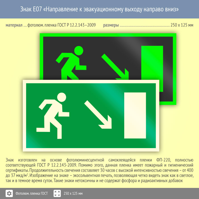 Знак E07 «Направление к эвакуационному выходу направо вниз» (фотолюминесцентная пленка ГОСТ 34428-2018, 250х125 мм) в Твери купить