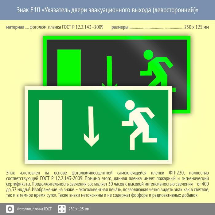Знак E10 «Указатель двери эвакуационного выхода (левосторонний)» (фотолюминесцентная пленка ГОСТ 34428-2018, 250х125 мм) в Твери купить