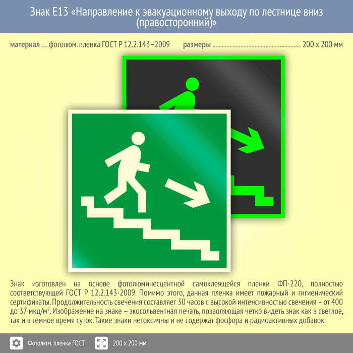 Знак E13 «Направление к эвакуационному выходу по лестнице вниз (правосторонний)» (фотолюминесцентная пленка ГОСТ 34428-2018, 200х200 мм) в Твери купить