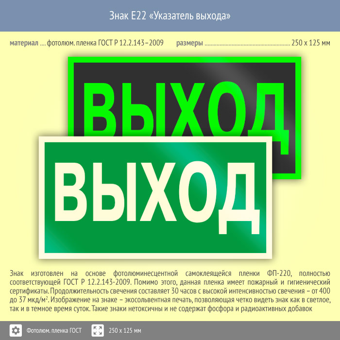 Знак E22 «Указатель выхода» (фотолюминесцентная пленка ГОСТ 34428-2018, 250х125 мм) в Твери купить