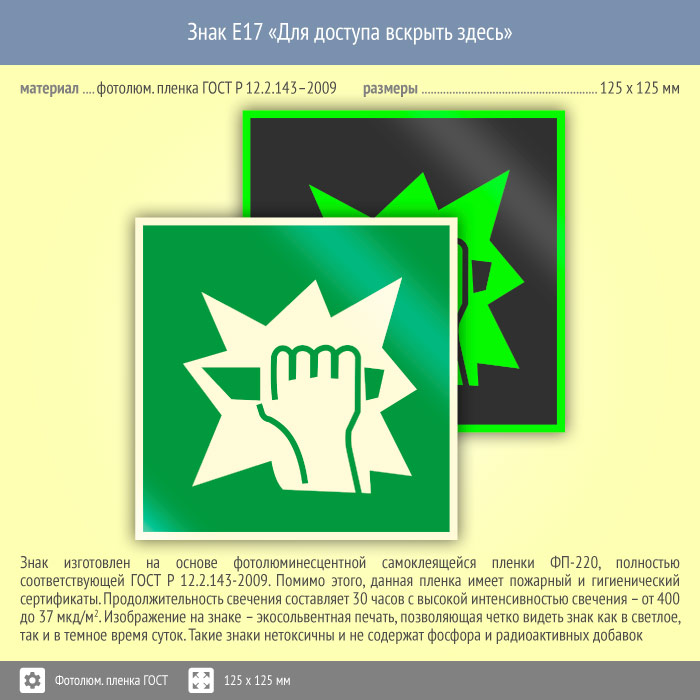 Знак E17 «Для доступа вскрыть здесь» (фотолюминесцентная пленка ГОСТ 34428-2018, 125х125 мм) в Твери купить