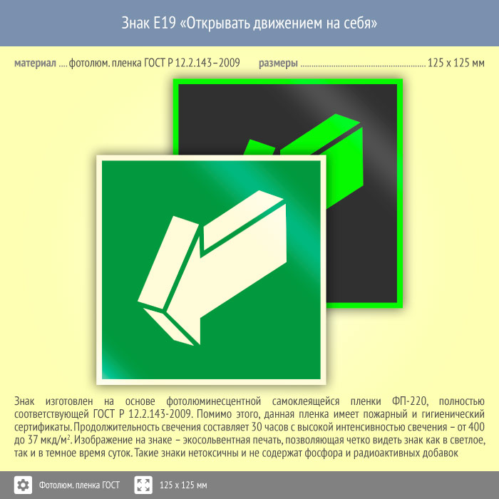 Знак E19 «Открывать движением на себя» (фотолюминесцентная пленка ГОСТ 34428-2018, 125х125 мм) в Твери купить