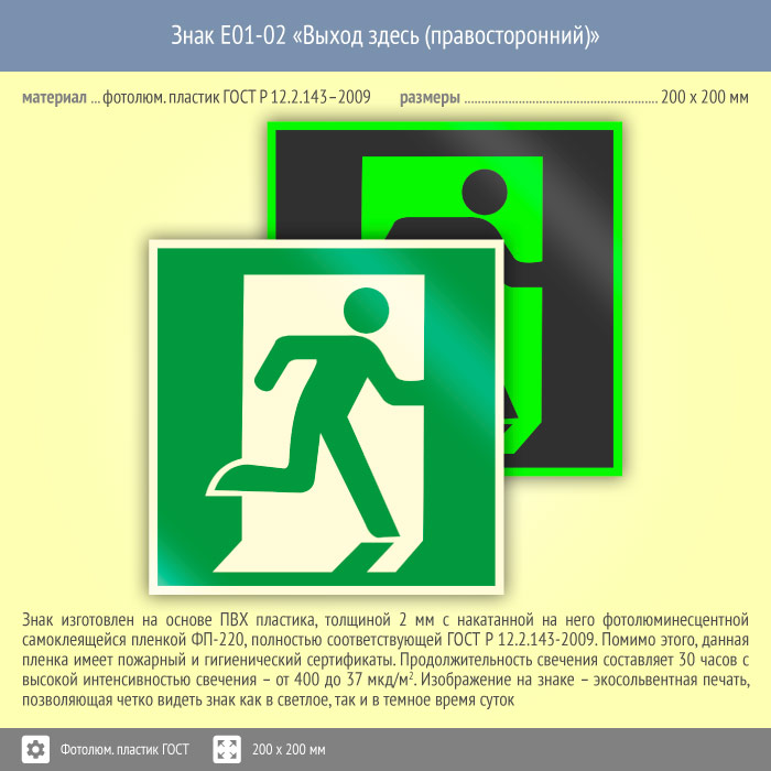 Знак E01-02 «Выход здесь (правосторонний)» (фотолюминесцентный пластик ГОСТ 34428-2018, 200х200 мм) в Твери купить