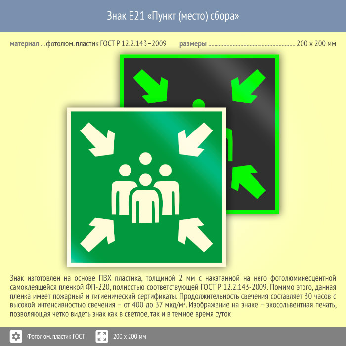 Знак E21 «Пункт (место) сбора» (фотолюминесцентный пластик ГОСТ 34428-2018, 200х200 мм) в Твери купить