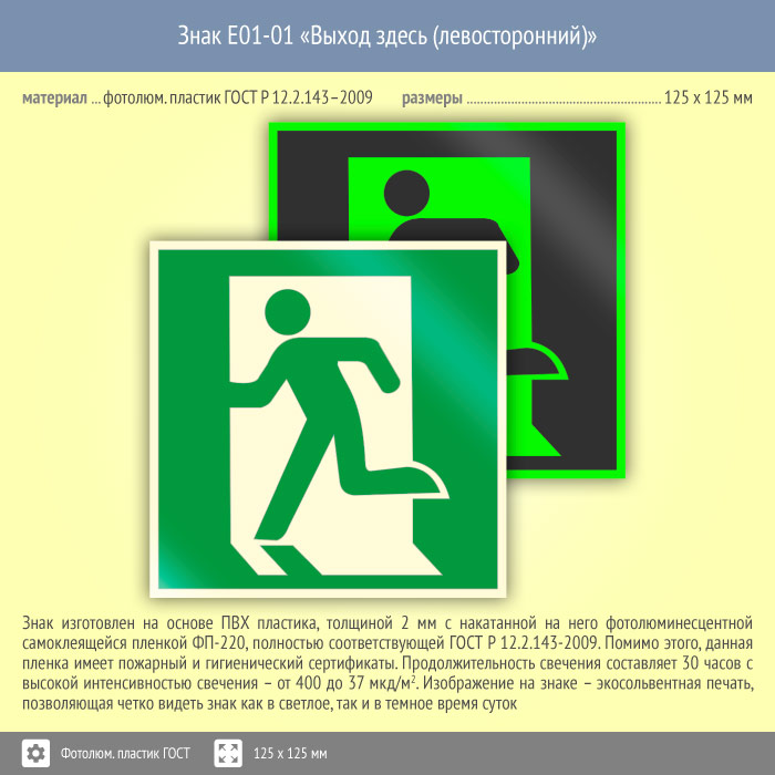 Знак E01-01 «Выход здесь (левосторонний)» (фотолюминесцентный пластик ГОСТ 34428-2018, 125х125 мм) в Твери купить