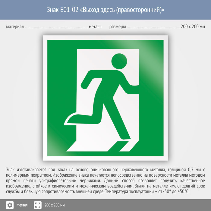 Знак E01-02 «Выход здесь (правосторонний)» (металл, 200х200 мм) в Твери купить