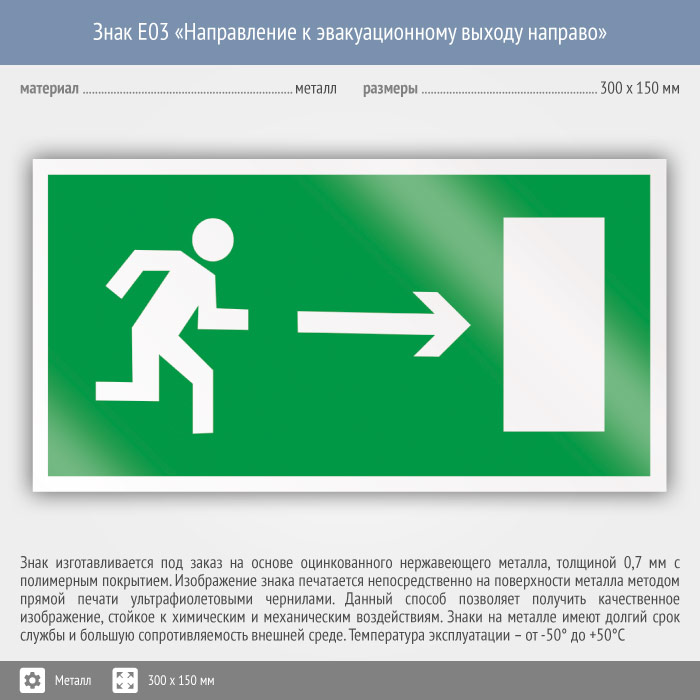 Знак E03 «Направление к эвакуационному выходу направо» (металл, 300х150 мм) в Твери купить
