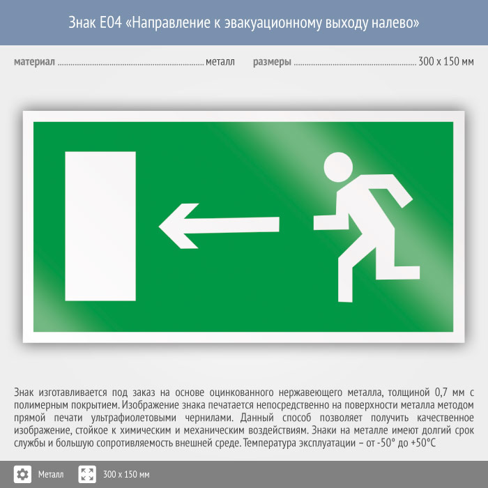 Знак E04 «Направление к эвакуационному выходу налево» (металл, 300х150 мм) в Твери купить