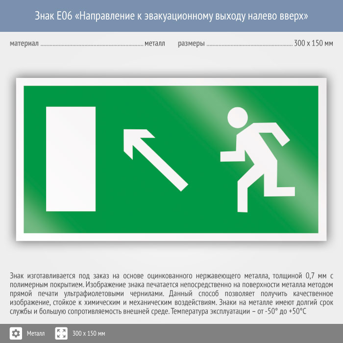 Знак E06 «Направление к эвакуационному выходу налево вверх» (металл, 300х150 мм) в Твери купить