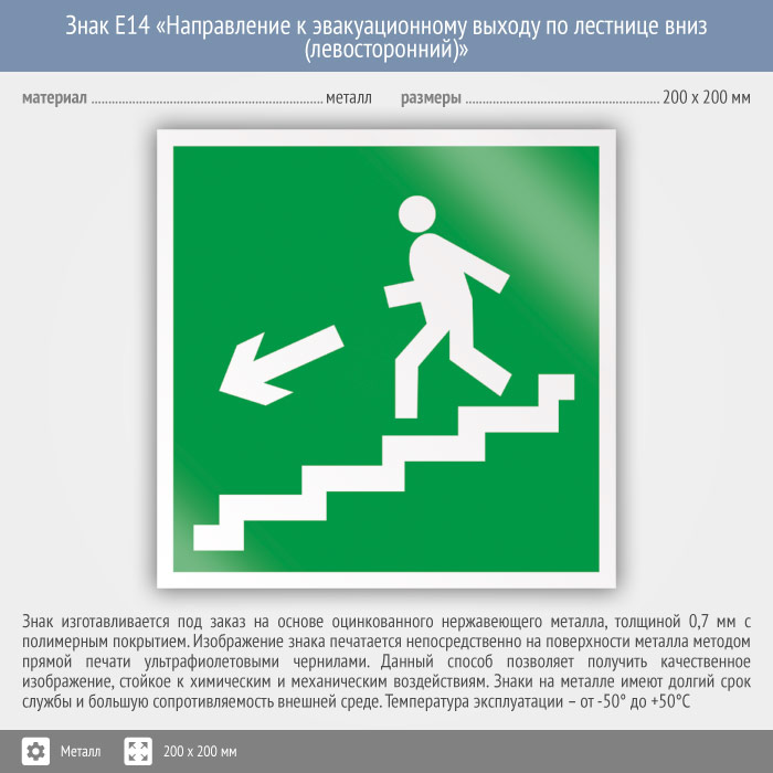 Знак E14 «Направление к эвакуационному выходу по лестнице вниз (левосторонний)» (металл, 200х200 мм) в Твери купить