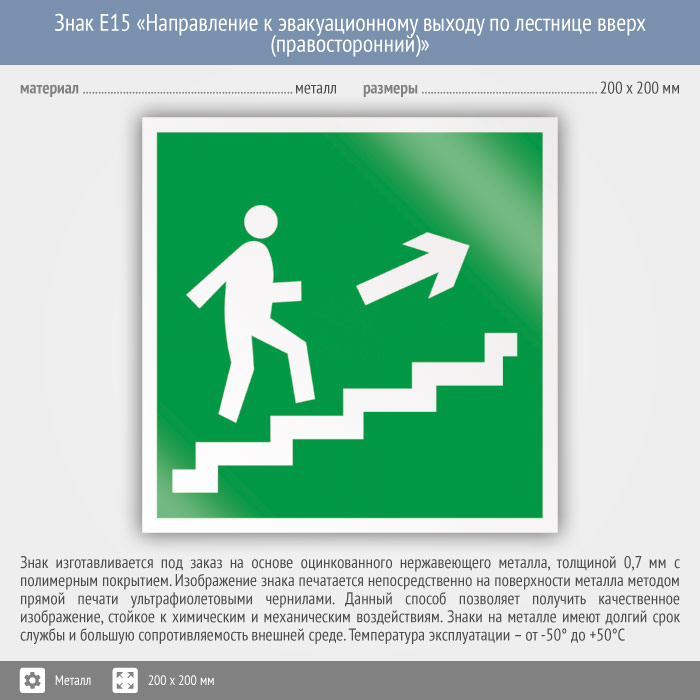 Знак E15 «Направление к эвакуационному выходу по лестнице вверх (правосторонний)» (металл, 200х200 мм) в Твери купить