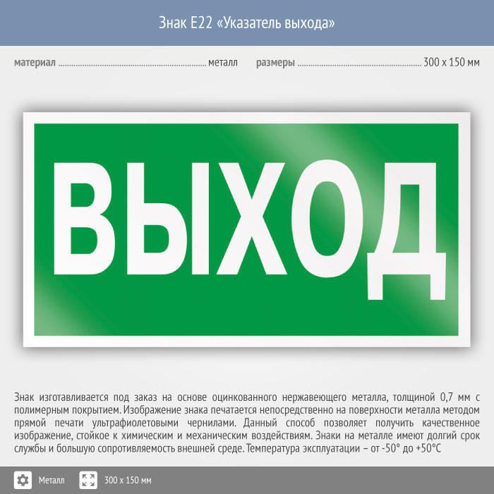 Знак E22 «Указатель выхода» (металл, 300х150 мм) в Твери купить