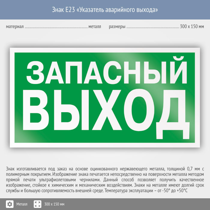 Знак E23 «Указатель запасного выхода» (устаревший) (металл, 300х150 мм) в Твери купить