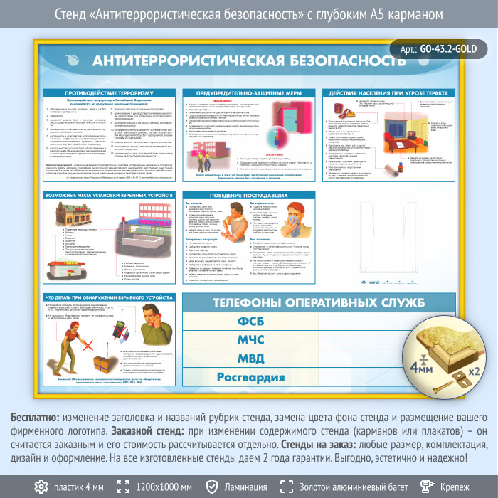 Стенд «Антитеррористическая безопасность» с глубоким А5 карманом (GO-43.2-GOLD) в Твери купить