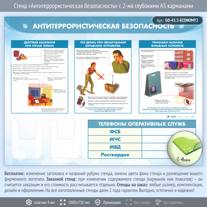 Стенд «Антитеррористическая безопасность» с 2-мя глубокими А5 карманами (GO-43.3-ECONOMY2) в Твери купить