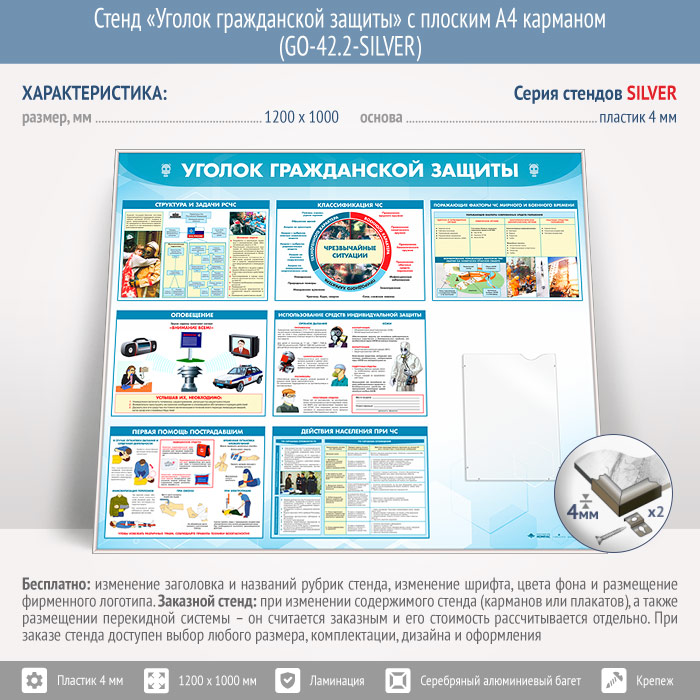 Стенд «Уголок гражданской защиты» с плоским А4 карманом (GO-42.2-SILVER) в Твери купить