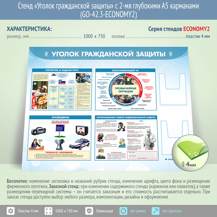 Стенд «Уголок гражданской защиты» с 2-мя глубокими А5 карманами (GO-42.3-ECONOMY2) в Твери купить