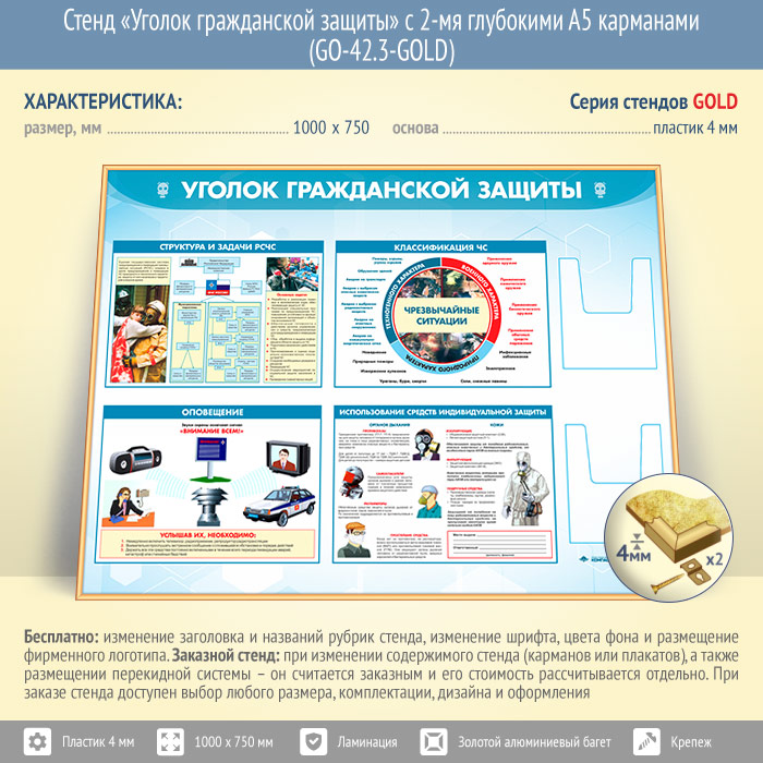 Стенд «Уголок гражданской защиты» с 2-мя глубокими А5 карманами (GO-42.3-GOLD) в Твери купить