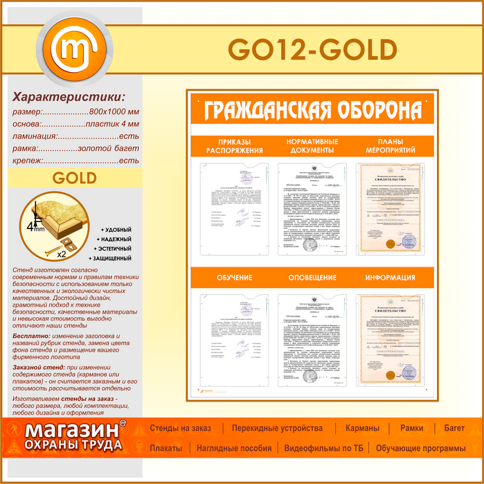 Стенд «Гражданская оборона» с 6 плоскими карманами (GO-12-GOLD) в Твери купить