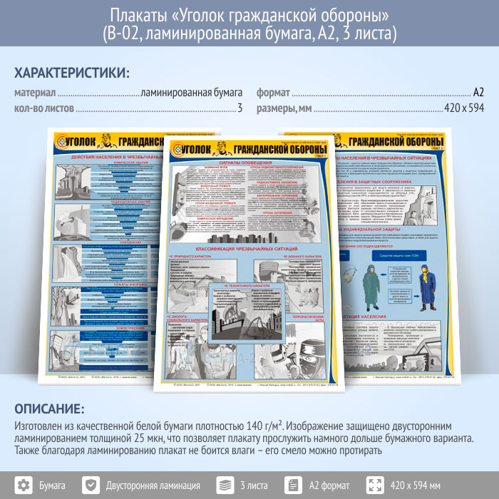 Плакаты «Уголок гражданской обороны» (В-02, ламинированная бумага, А2, 3 листа) в Твери купить