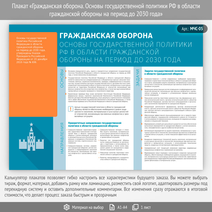 Плакат «Гражданская оборона. Основы государственной политики РФ в области гражданской обороны на период до 2030 года» (МЧС-05, 1 лист) в Твери купить