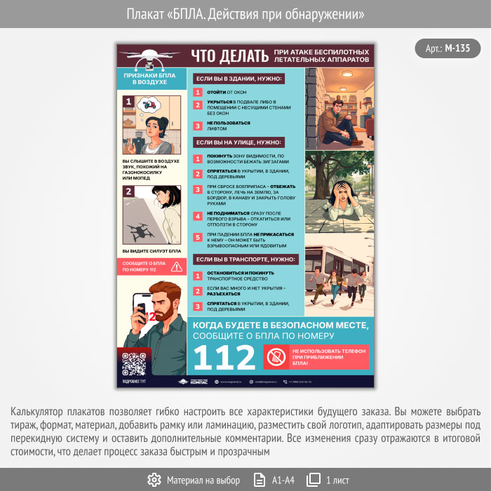Плакат «БПЛА. Действия при обнаружении» с QR (М-135, 1 лист) в Твери купить
