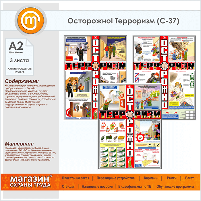 Плакаты «Осторожно! Терроризм» (С-37, ламинированная бумага, А2, 3 листа) в Твери купить