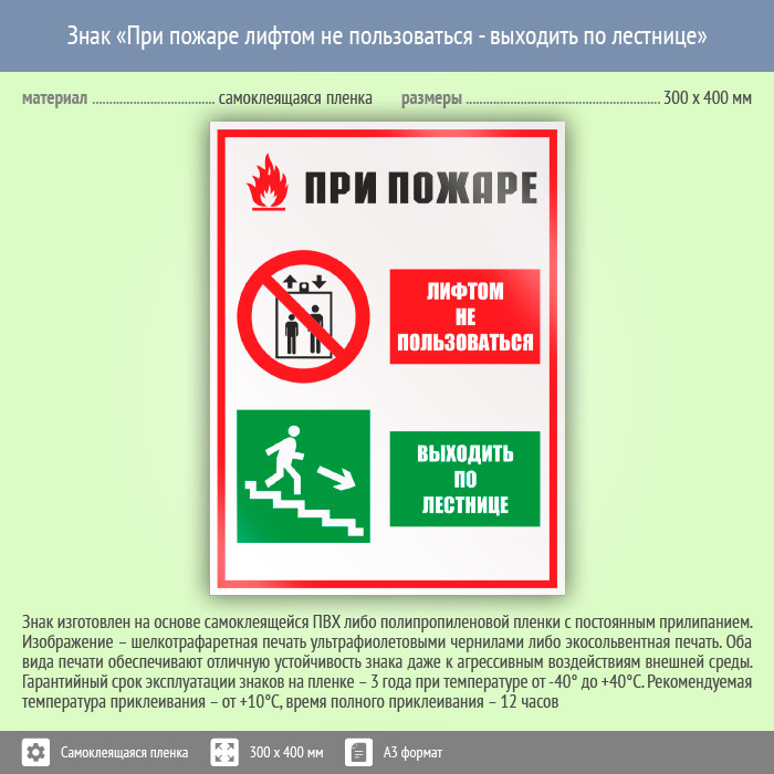 Знак «При пожаре лифтом не пользоваться - выходить по лестнице», КЗ-73 (пленка, 300х400 мм) в Твери купить