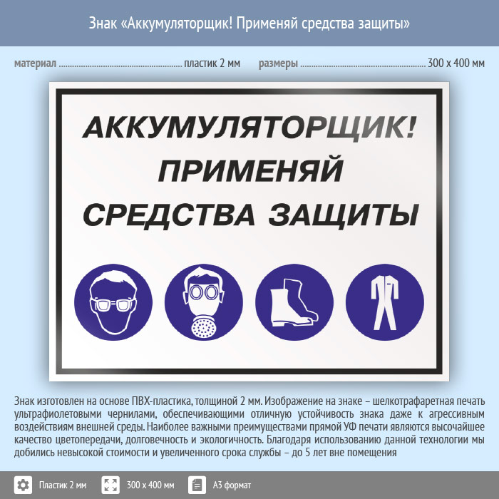Знак «Аккумуляторщик! Применяй средства защиты», КЗ-02 (пластик, 400х300 мм) в Твери купить