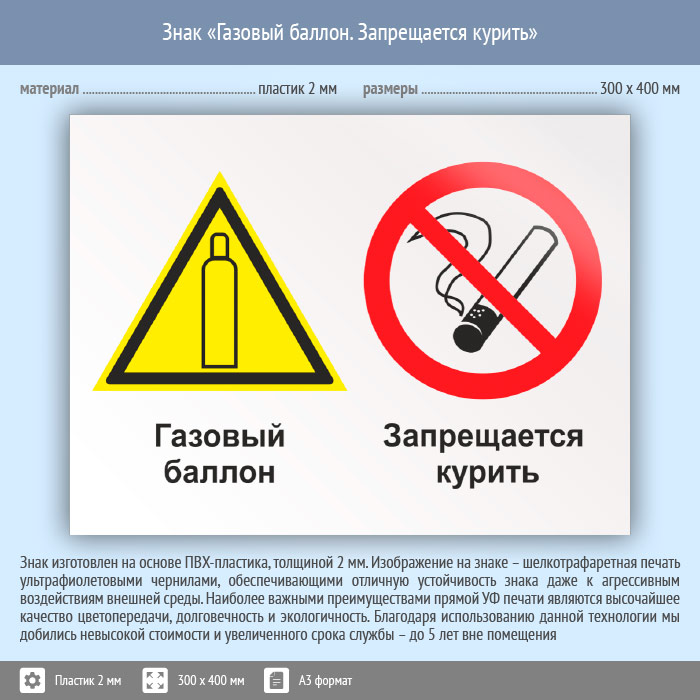 Знак «Газовый баллон. Запрещается курить», КЗ-18 (пластик, 400х300 мм) в Твери купить