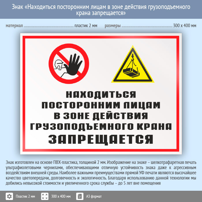 Знак «Находиться посторонним лицам в зоне действия грузоподъемного крана запрещается», КЗ-23 (пластик, 400х300 мм) в Твери купить
