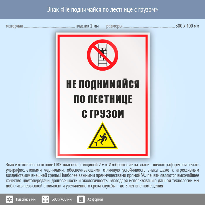 Знак «Не поднимайся по лестнице с грузом», КЗ-28 (пластик, 300х400 мм) в Твери купить