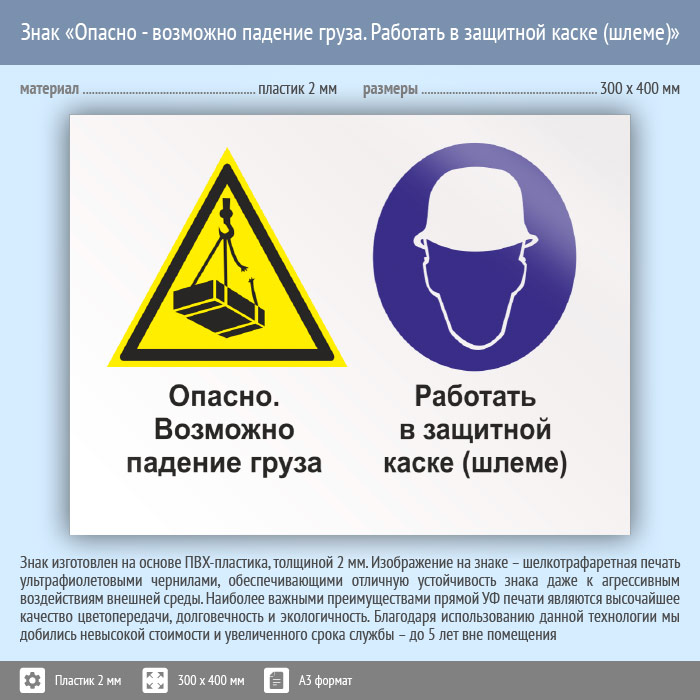 Знак «Опасно - возможно падение груза. Работать в защитной каске (шлеме)», КЗ-34 (пластик, 400х300 мм) в Твери купить
