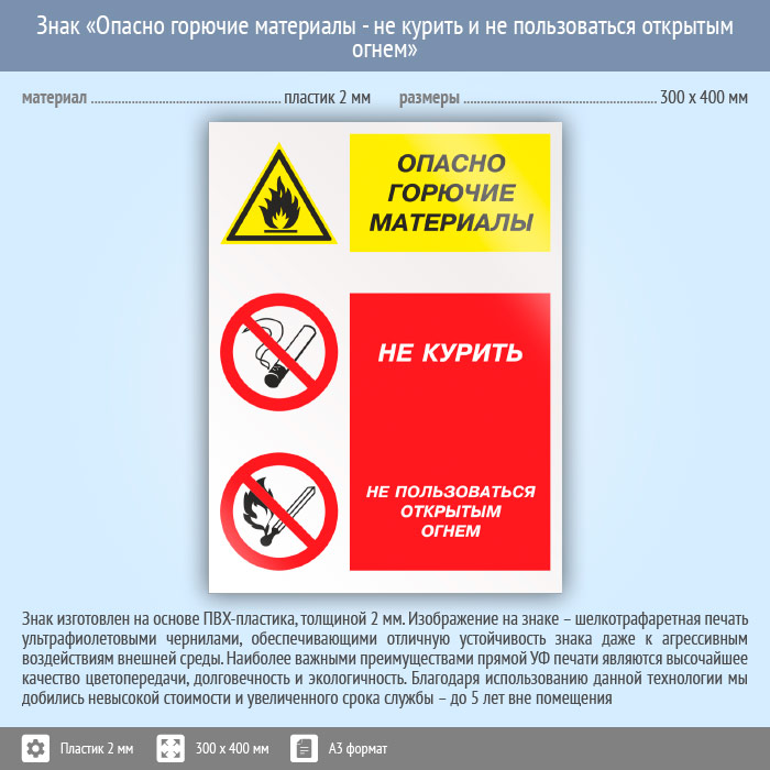 Знак «Опасно горючие материалы - не курить и не пользоваться открытым огнем», КЗ-45 (пластик, 300х400 мм) в Твери купить