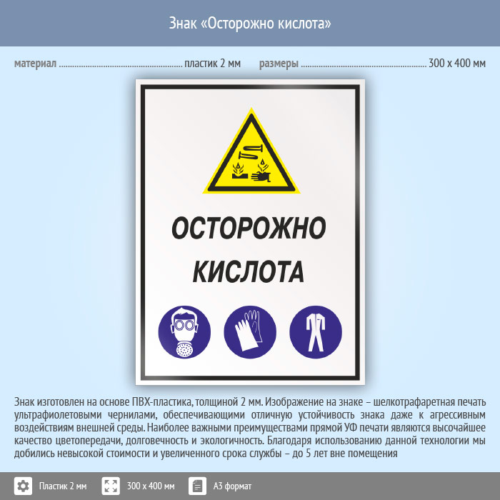 Знак «Осторожно кислота», КЗ-61 (пластик, 300х400 мм) в Твери купить