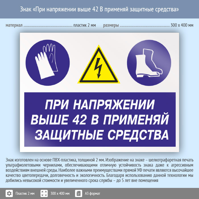 Знак «При напряжении выше 42 В применяй защитные средства», КЗ-72 (пластик, 400х300 мм) в Твери купить