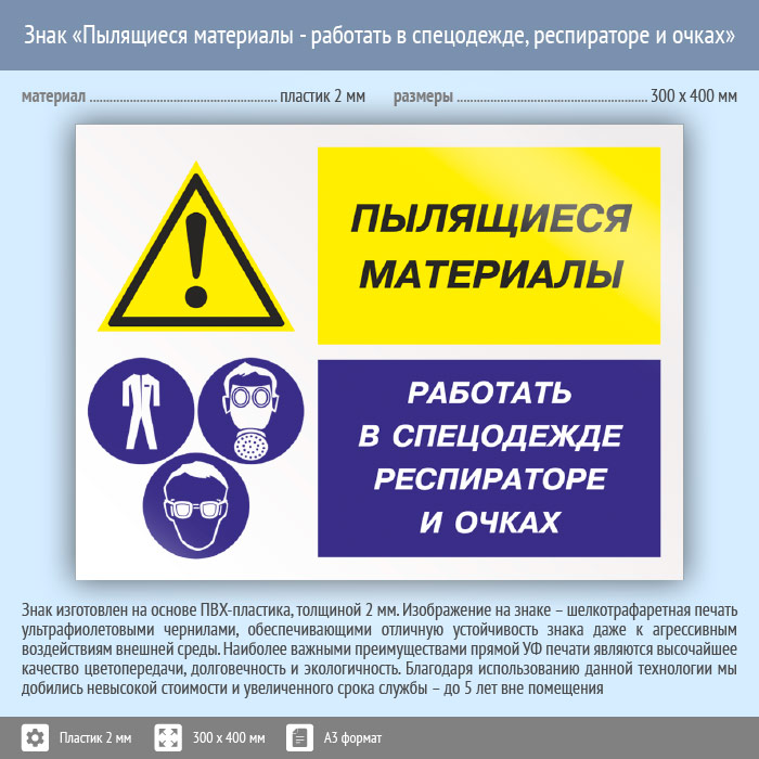 Знак «Пылящиеся материалы - работать в спецодежде, респираторе и очках», КЗ-79 (пластик, 400х300 мм) в Твери купить
