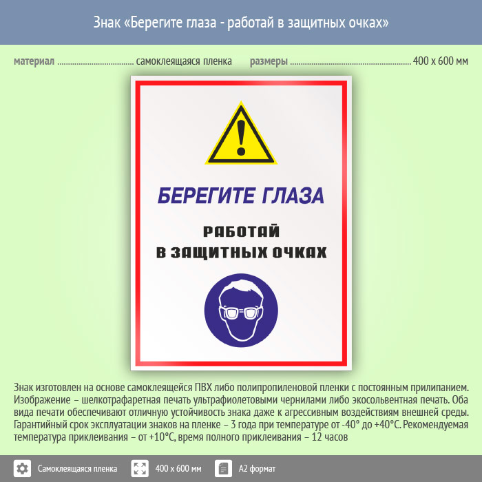 Знак «Берегите глаза - работай в защитных очках», КЗ-04 (пленка, 400х600 мм) в Твери купить