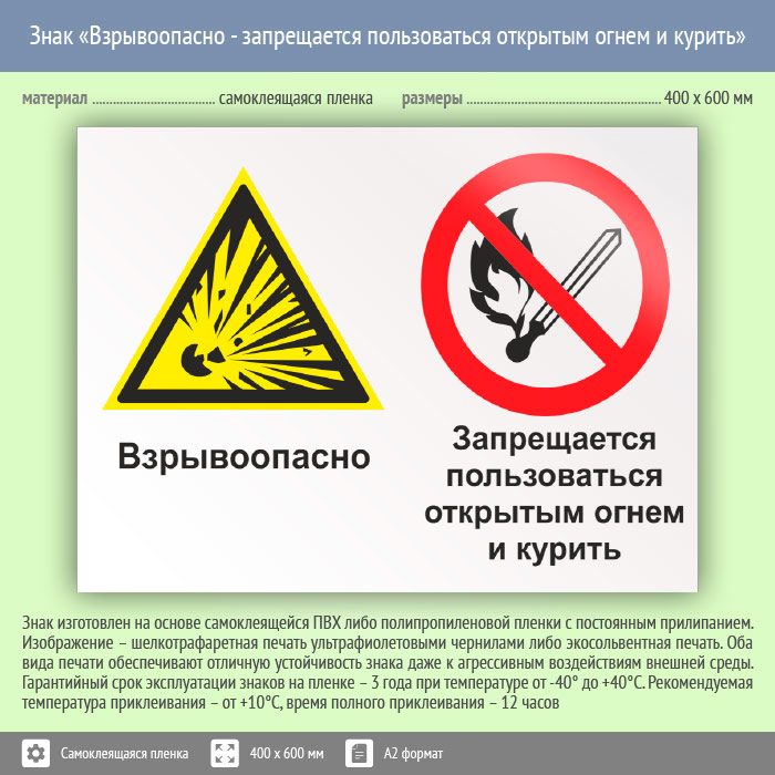 Знак «Взрывоопасно - запрещается пользоваться открытым огнем и курить», КЗ-07 (пленка, 600х400 мм) в Твери купить