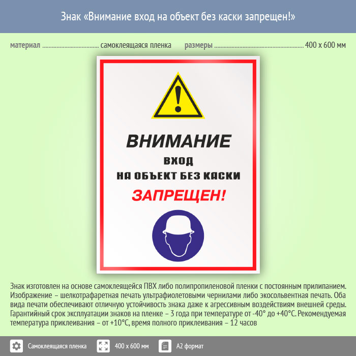 Знак «Внимание вход на объект без каски запрещен!», КЗ-13 (пленка, 400х600 мм) в Твери купить